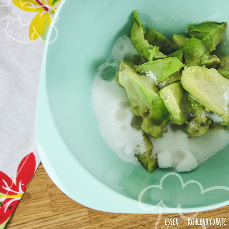 Avocado, Zucker und Limettensaft in eine Schüssel geben.