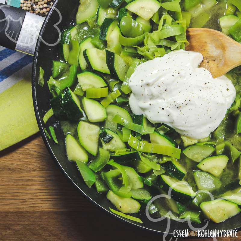 Zwiebel und Knoblauch hacken und im Bratfett glasig andünsten. Das Gemüse waschen. Paprika und Zucchini in Stücke, Lauch und Lauchzwiebel in Ringe schneiden. Alles in die Pfanne geben und kurz anbraten. Mit der Gemüsebrühe ablöschen und bei mittlerer Hitze etwa 10 Minuten köcheln lassen.