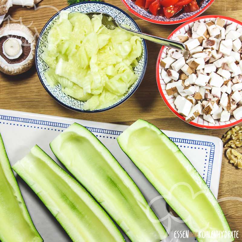 Zucchini längs halbieren und mit einem kleinen Löffel das Fruchtfleisch auslösen, klein schneiden und in einer Schüssel zur Seite stellen.Für die Füllung, Zwiebel fein hacken und mit dem Olivenöl in einer Pfanne kurz anbraten. Knoblauch fein hacken und mit dem Zucchinifruchtfleisch in die Pfanne geben. Champignons in kleine Stücke schneiden, hinzufügen und alles für ein paar Minuten anschwitzen. Tomaten klein würfeln und Lauchzwiebeln in feine Ringe schneiden. Beides in die Pfanne geben und anbraten. Pfanne vom Herd nehmen und den Frischkäse einrühren. Alles mit Salz und Pfeffer würzen.