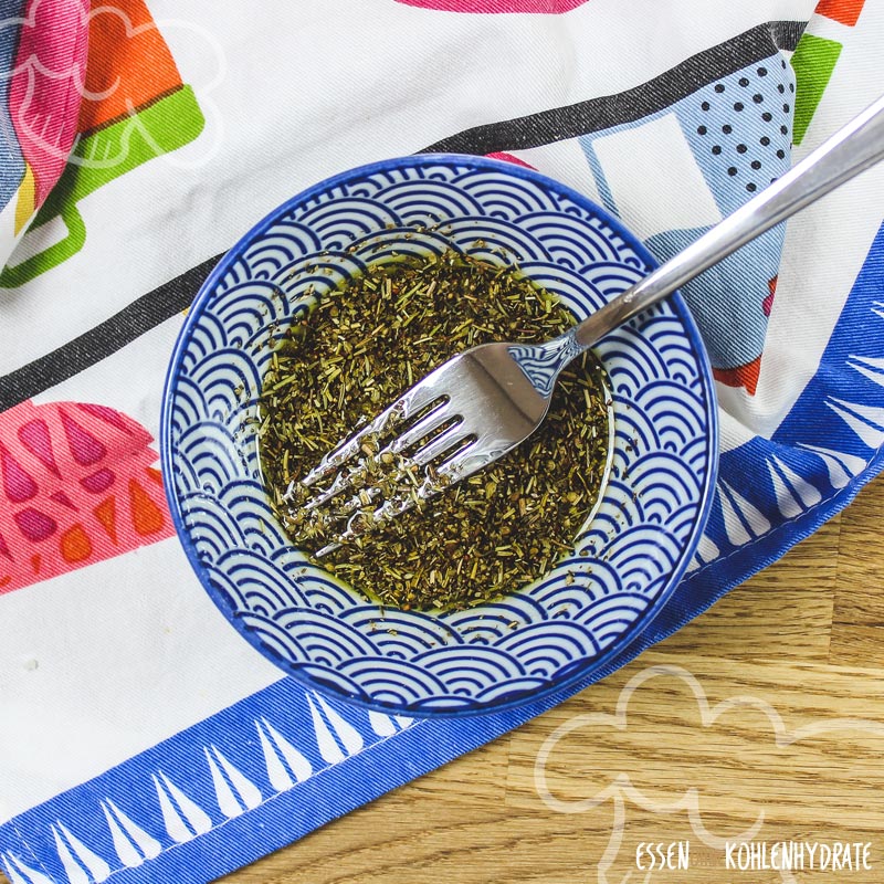 Für die Marinade Olivenöl, Kräuter, Salz und Pfeffer miteinander verrühren.