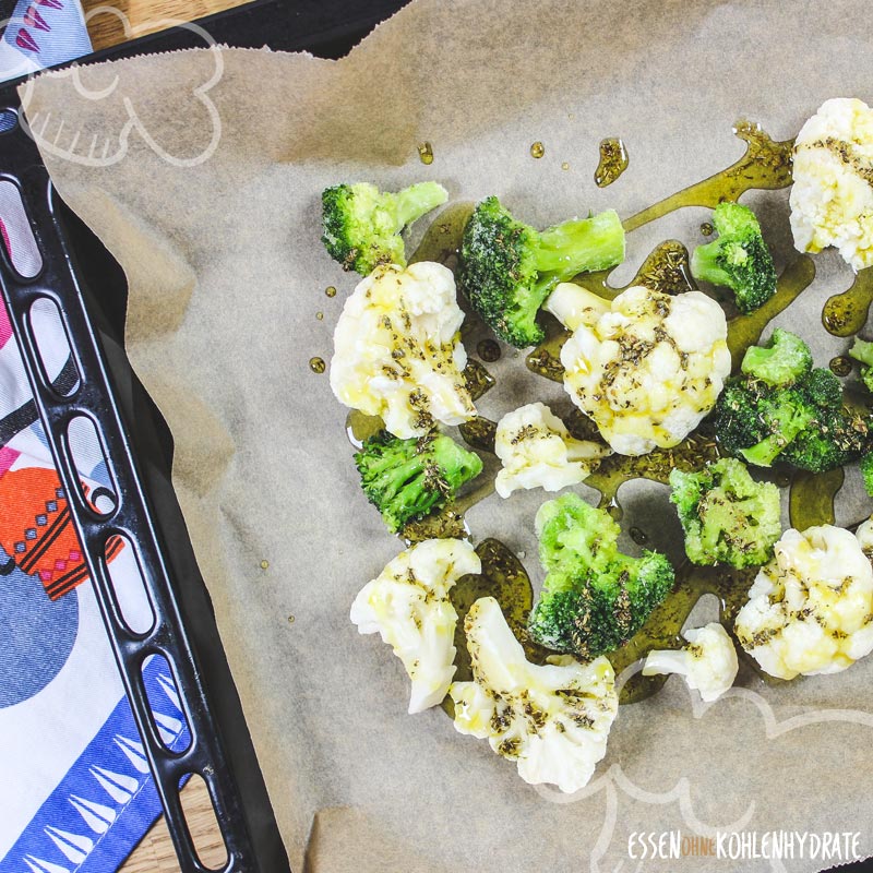 Alle Zutaten bereit stellen. Ich habe hier tiefgekühltes Gemüse verwendet, aber natürlich funktioniert das Rezept auch mit frischem Brokkoli und Blumenkohl.