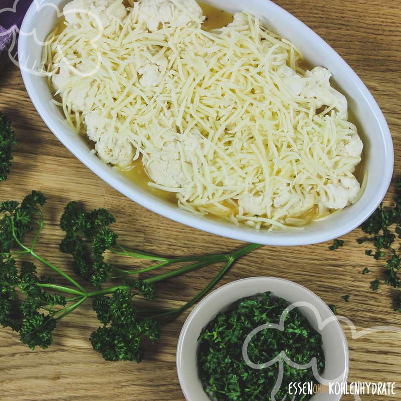 Sehr sehr einfaches Rezept: Ein Ei als Basis, Blumenkohl dazu, würzen und gerieben Käse drüber. Und ab in den Ofen. Mega lecker!