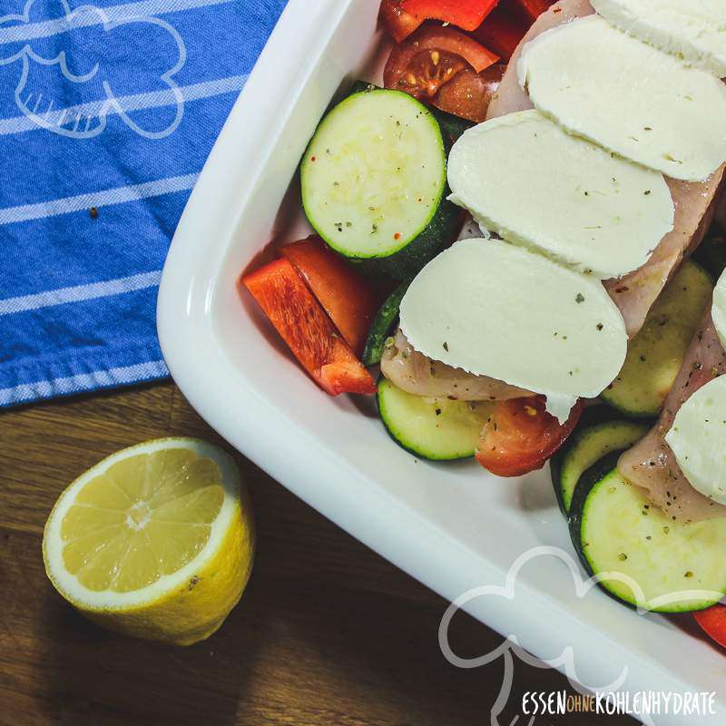 Ein tolles Gericht für den Feierabend – Ofenhähnchen mit Mozzarella und buntem Gemüse. Proteinreich und Low Carb! Das leckere Ofengericht ist einfach und schnell zubereitet. Ideal für jeden Tag! Schmeckt unglaublich gut und ist auch noch richtig gesund.