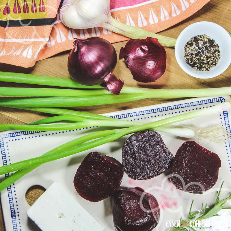 Lauchzwiebel waschen, trocknen und in Ringe schneiden. Zwiebel in grobe Stücke schneiden. Rote Beete in Spalten schneiden. Alles in eine Auflaufform geben. Rosmarinblätter abzupfen und mit dem getrockneten Thymian über das Gemüse streuen. Feta darüber bröseln.
