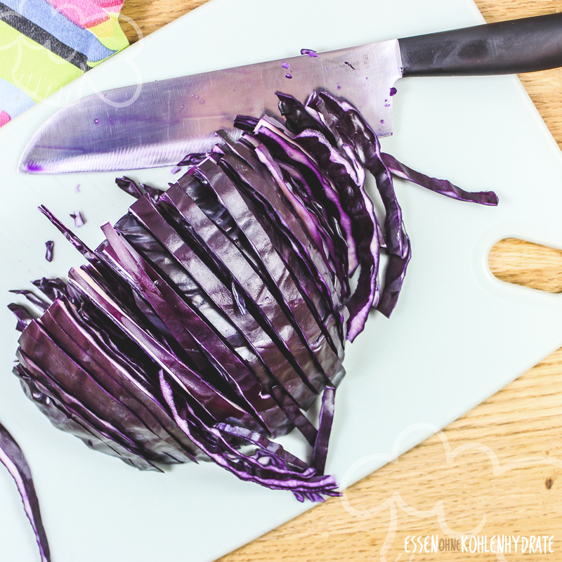 Die äußeren Blätter und den Strunk des Rotkohls entfernen und den Rest in feine Streifen schneiden.