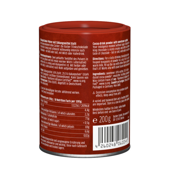 Diese lecker-cremige Trinkschokolade ist nur mit Xylit gesüßt. Sie eignet sich für die Herstellung von Heißgetränken, kann aber – mit ein wenig warmer Milch oder Milchalternative angerührt – auch kalt getrunken werden.